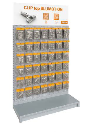 Kwalitatieve scharnieren en accessoires zoals een boormal, pendrukker, scharnieren en ladegeleiders van het merk Blum, beschikbaar voorverpakt of in bulkverpakking.