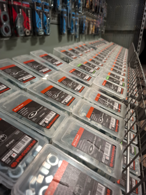 Een compleet assortiment in praktische blisters en kuipjes, van spaanplaatschroeven tot krammen, moeren en oogschroeven, verkrijgbaar in alle materialen en afwerkingen.